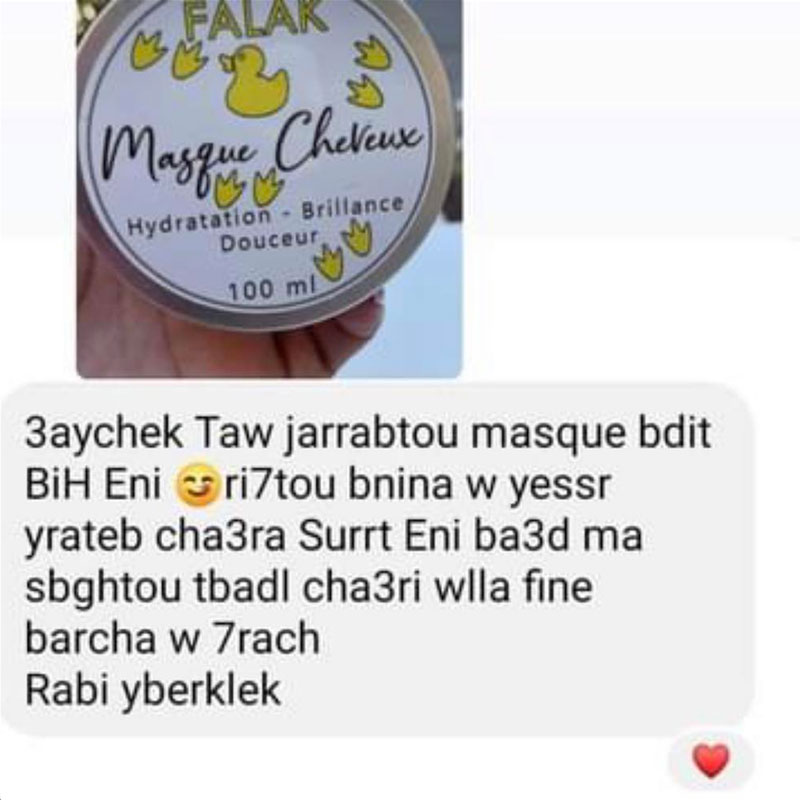 N'attendez plus pour offrir à vos cheveux l'attention qu'ils méritent. Commandez dès maintenant notre masque capillaire Falak et découvrez le secret d'une chevelure éblouissante, nourrie et protégée. Vos cheveux vous remercieront. Commandez dès aujourd'hui et revivez la beauté naturelle de vos cheveux avec nos produit naturels.